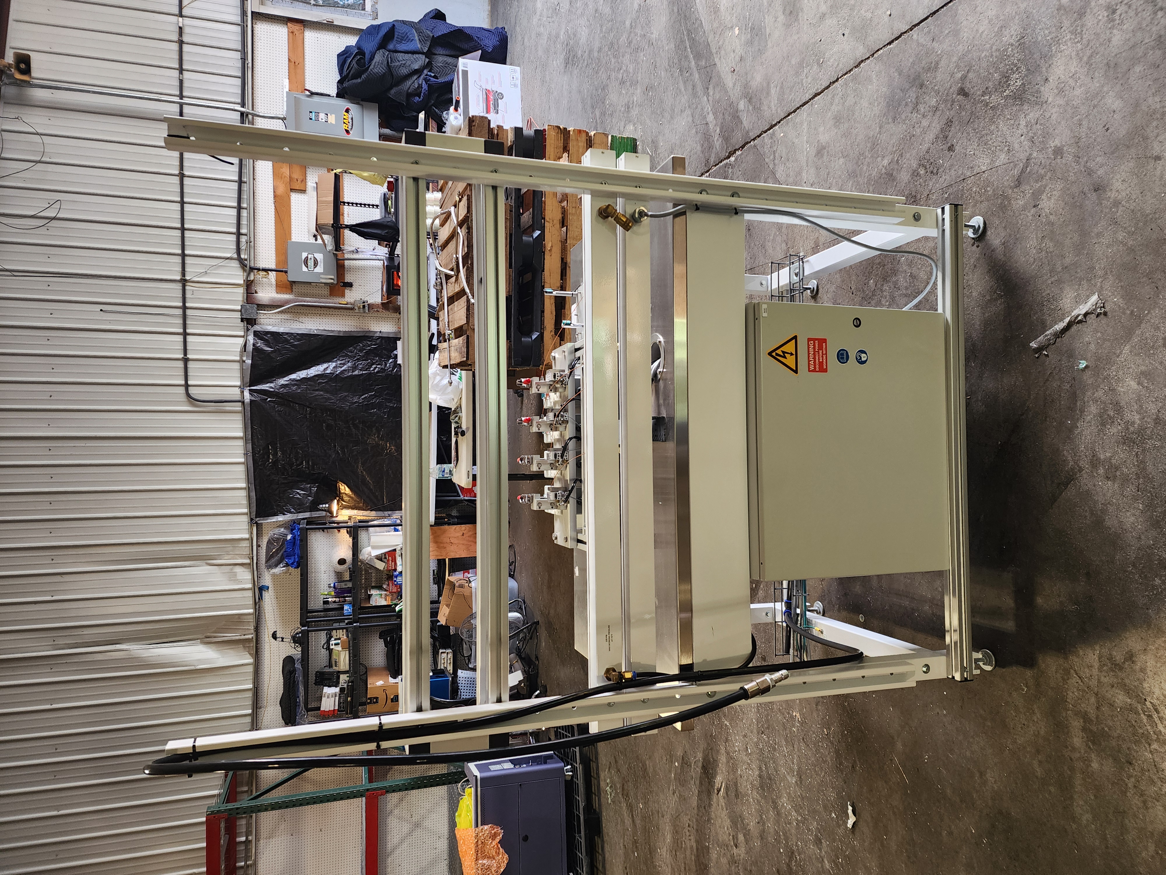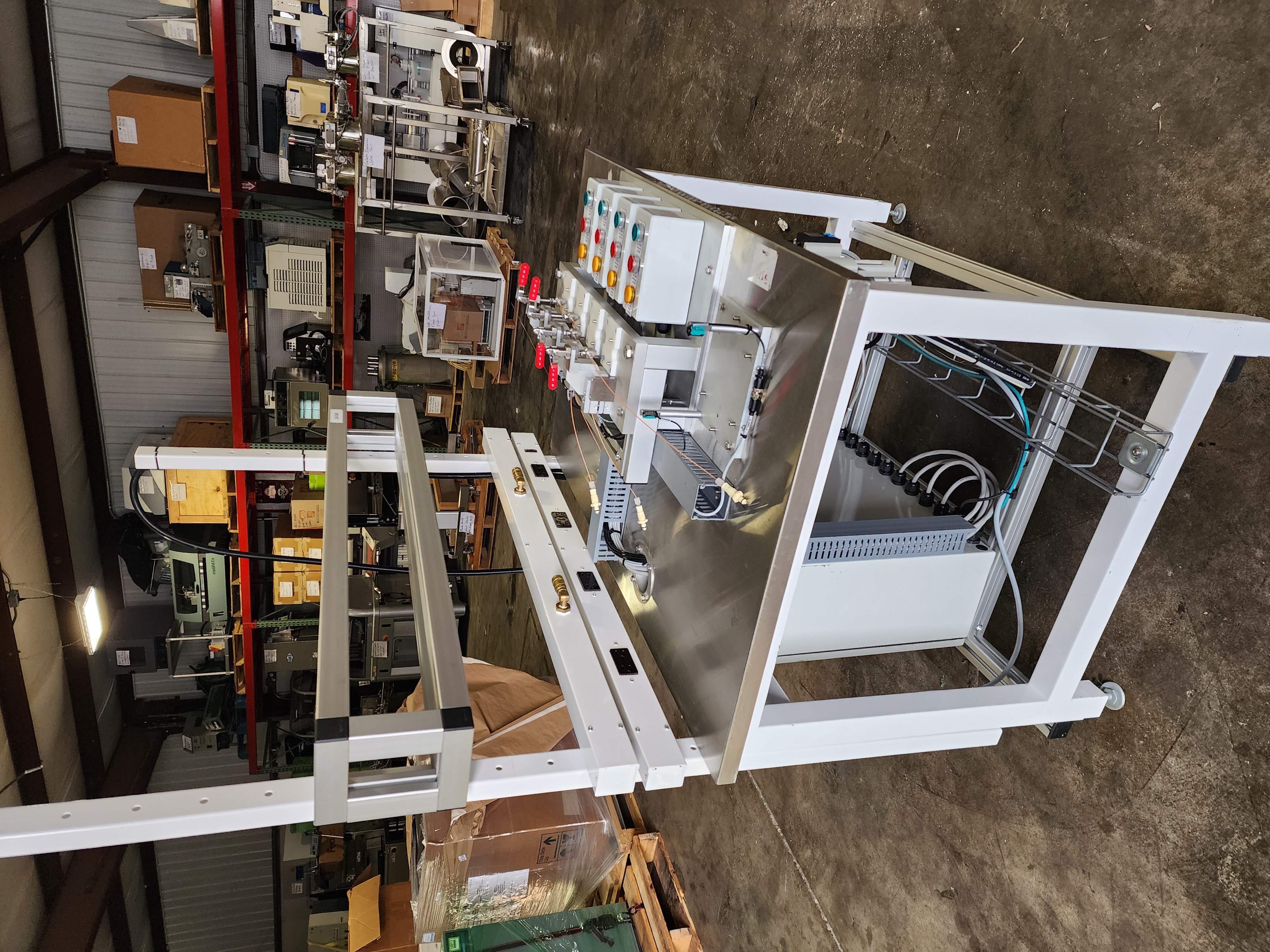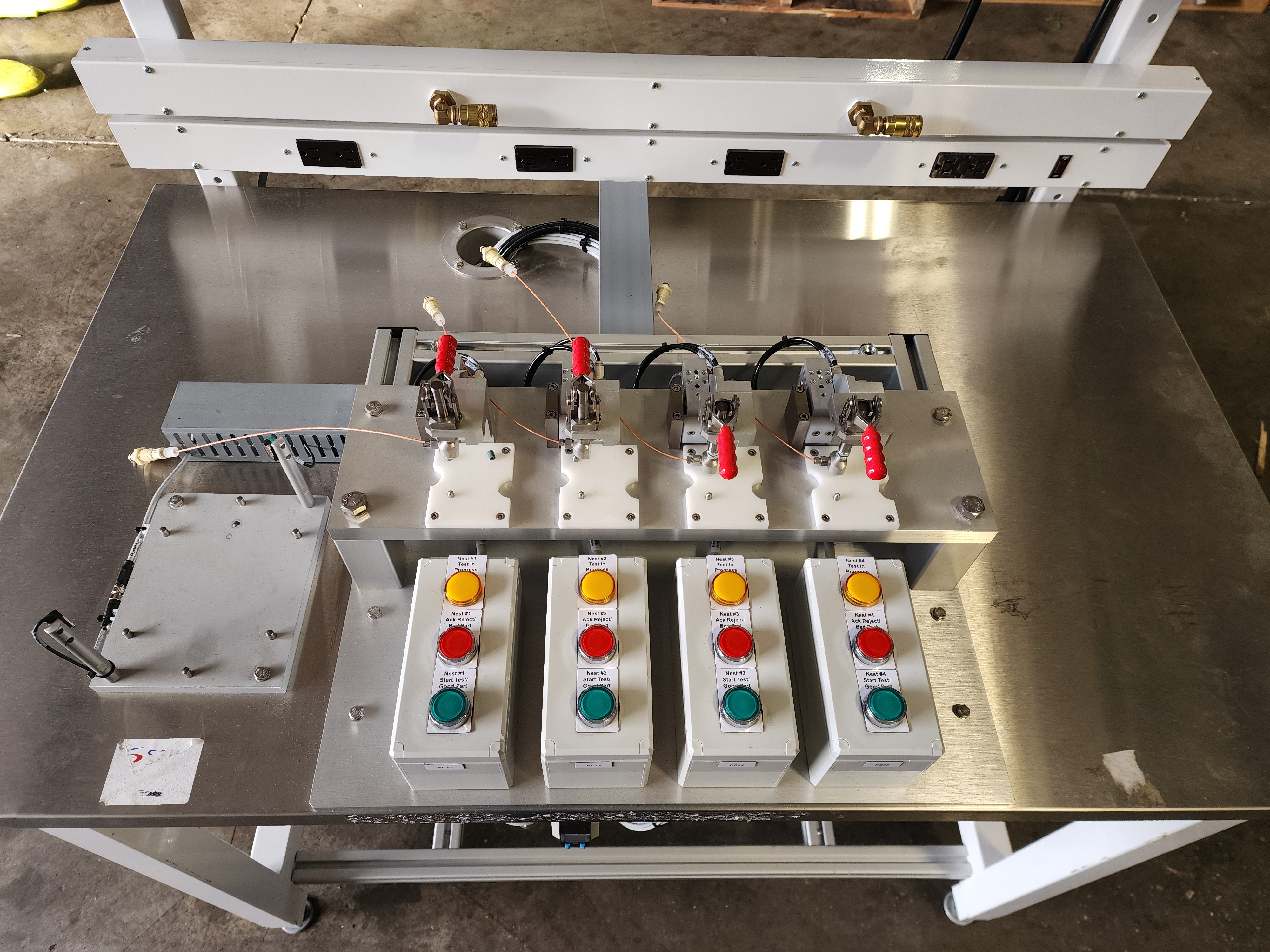 This is a well-built, custom 4-station pneumatic leak and pressure decay test workstation configured for biopharma or medical device quality control applications. The system is built on a Workplace Systems stainless-top modular bench with overhead utility rail, integrated power outlets, and compressed air quick-connects. Pneumatic control is handled by a Festo MS6 smart programmable pressure regulator, Festo MS6-EM1-1/2-S motorized shutoff valve, and an 8-station Festo solenoid valve manifold — all premium components in good condition with strong standalone value. Four precision pneumatic test nest fixtures are each paired with dedicated operator control stations and appear to be equipped with toggle clamps and proximity sensor interlocks. High-pressure stainless braided hose assemblies and a fully labeled wiring harness are included. An excellent opportunity for an automation integrator, contract manufacturer, or biopharma QC operation seeking a high-quality, largely complete test platform at well below new build cost.