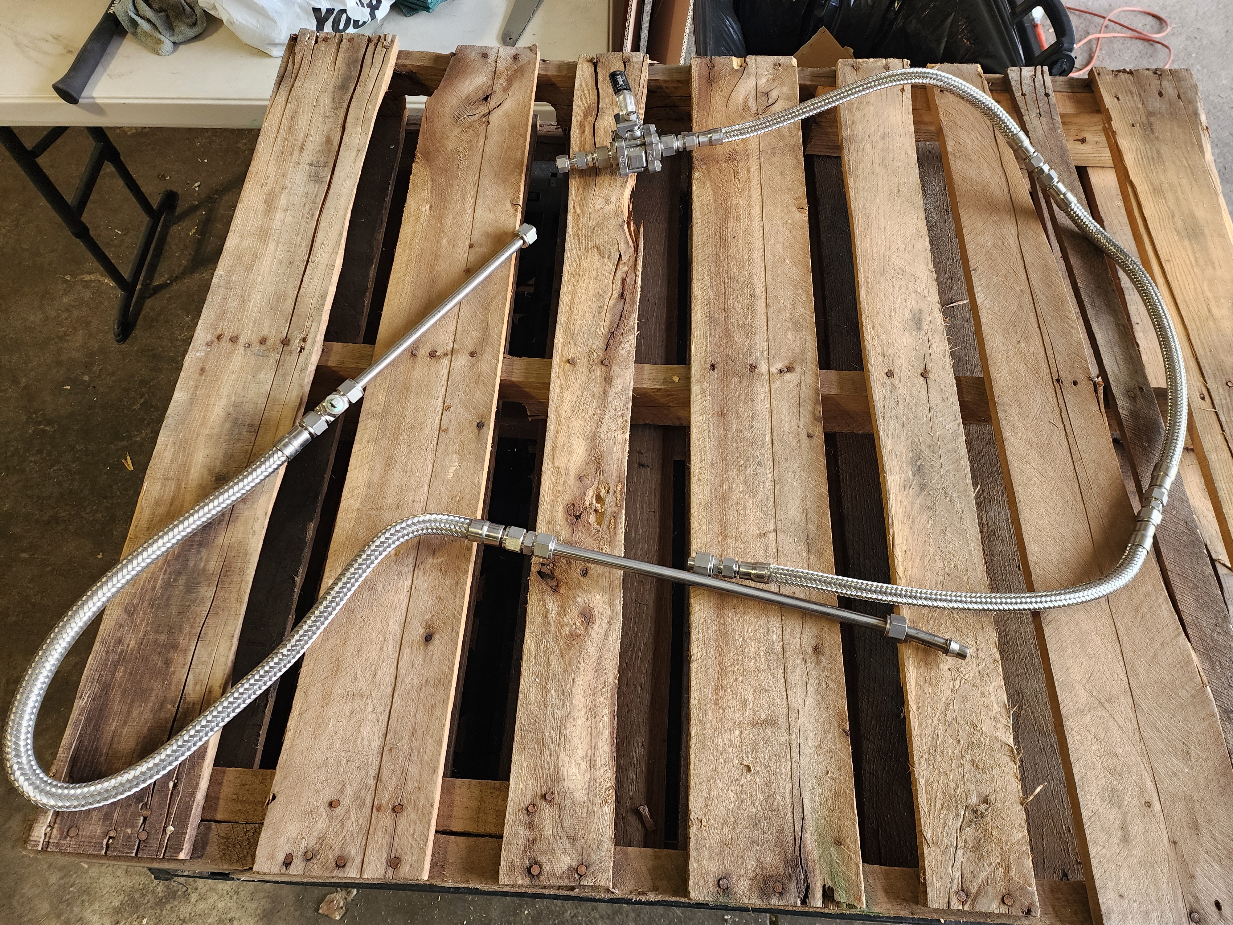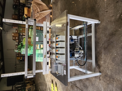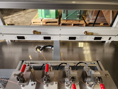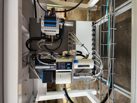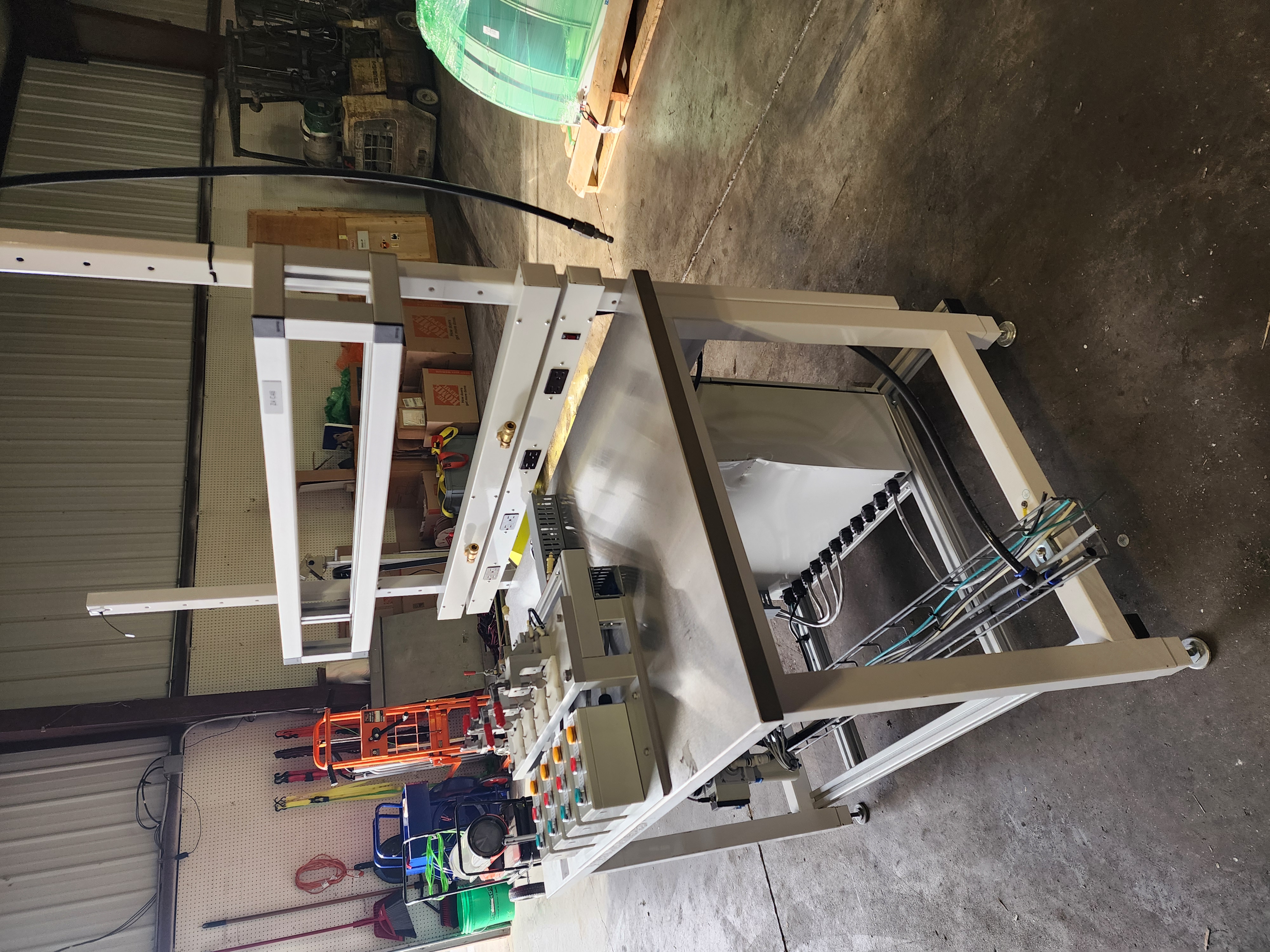 This is a well-built, custom 4-station pneumatic leak and pressure decay test workstation configured for biopharma or medical device quality control applications. The system is built on a Workplace Systems stainless-top modular bench with overhead utility rail, integrated power outlets, and compressed air quick-connects. Pneumatic control is handled by a Festo MS6 smart programmable pressure regulator, Festo MS6-EM1-1/2-S motorized shutoff valve, and an 8-station Festo solenoid valve manifold — all premium components in good condition with strong standalone value. Four precision pneumatic test nest fixtures are each paired with dedicated operator control stations and appear to be equipped with toggle clamps and proximity sensor interlocks. High-pressure stainless braided hose assemblies and a fully labeled wiring harness are included. An excellent opportunity for an automation integrator, contract manufacturer, or biopharma QC operation seeking a high-quality, largely complete test platform at well below new build cost.